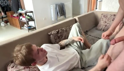 Hot nextdoor guy gets massaged his huge dick by 2 guys !